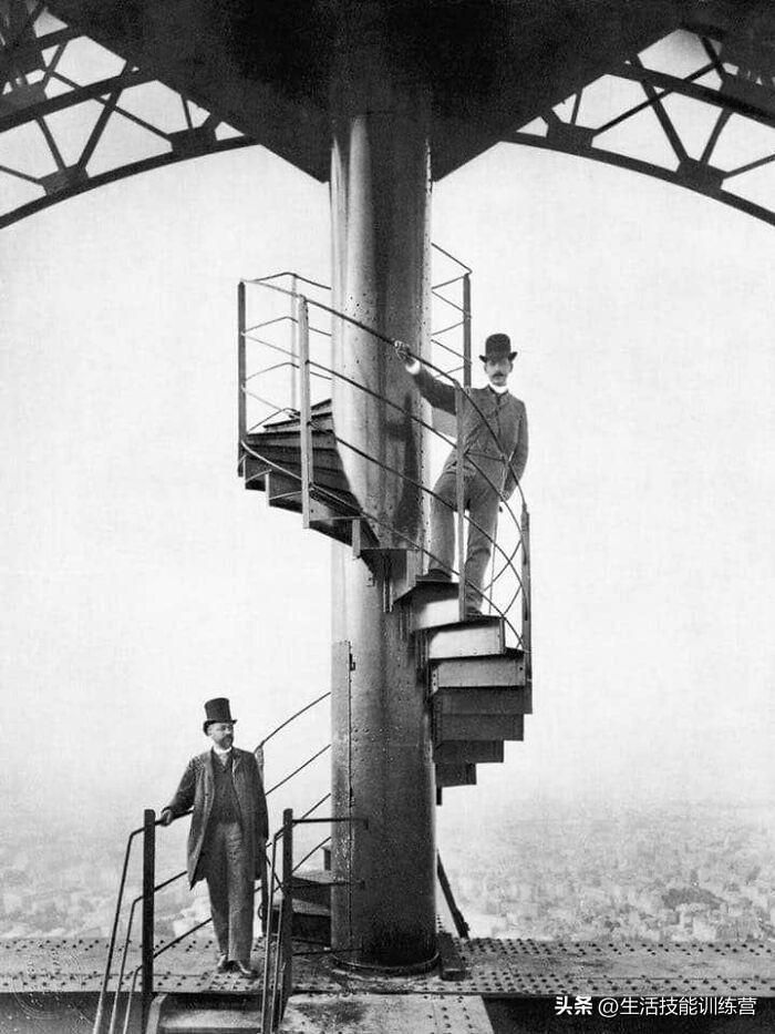 亚历山大·古斯塔夫·埃菲尔与朋友一起探索已完工的铁塔,摄于 1889 年。