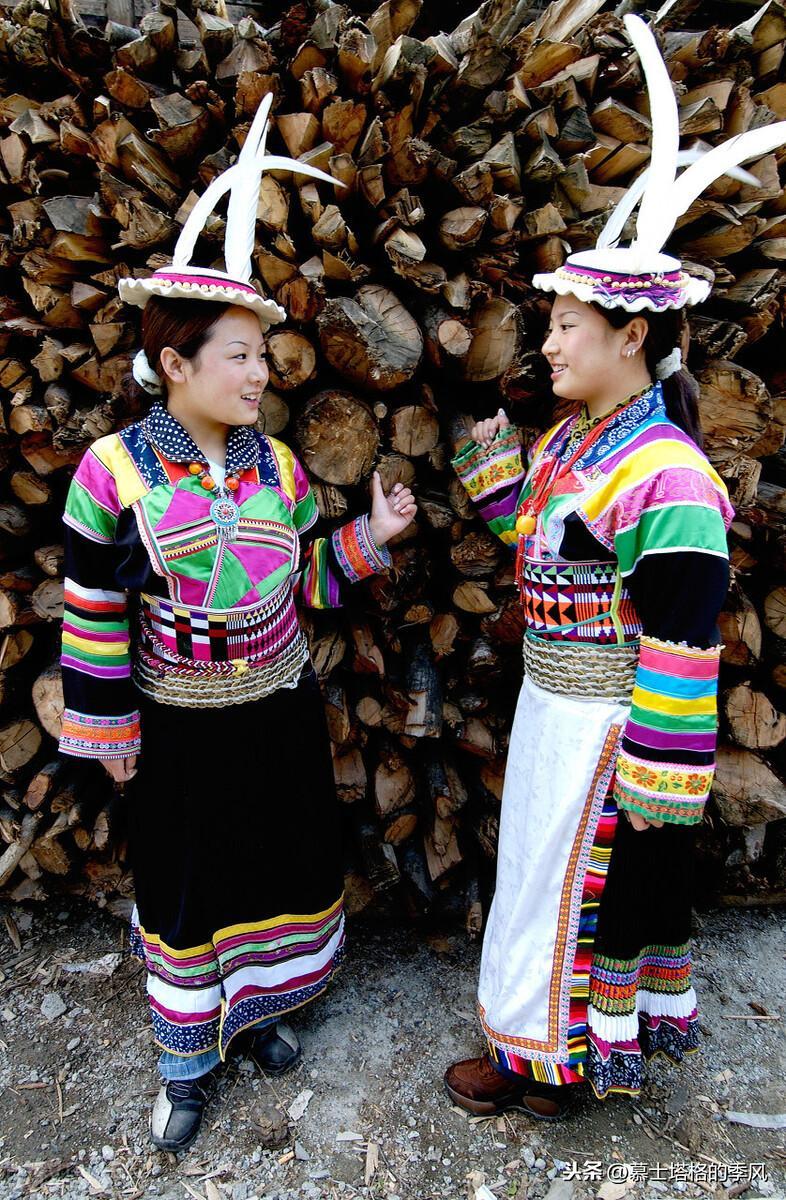 白马藏族的服饰就更有特点了,其中头饰最具特色,也非常好看,他们戴的是由羊毛压模后制成的白色荷叶边毡帽,叫“盘盘帽”,又叫“蝉皮帽”,帽子上面缠有红,蓝,黑三色的彩带,帽顶前端有一簇锦鸡颈羽装饰并插白色雄鸡尾羽,这也是白马藏族的标志,男子插一支,女子没有出嫁的插一支尾羽,出嫁了的插两支或三只尾羽。男子插一支挺直的羽毛,表示心要直,人品要好,女子插几支弯曲的羽毛,象征纯洁温柔。