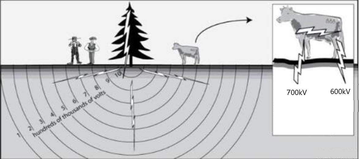 当一道雷电击中树木或者周围的地面时,电流会顺着地面扩散到远处。其中越靠近雷电击中点,电压就越高,距离雷电击中点越远,电压就会越低。
