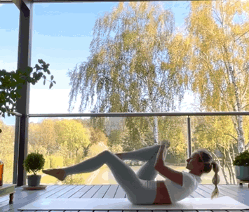 臀部落地,双手手肘撑地呼气,收紧核心双腿伸直并紧,顺时针画圈重复练习10-12次