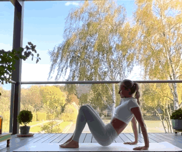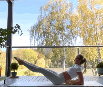 坐姿准备,呼气,收紧核心双腿伸直并紧倒向身后进入犁式吸气,还原,重复练习5-8次