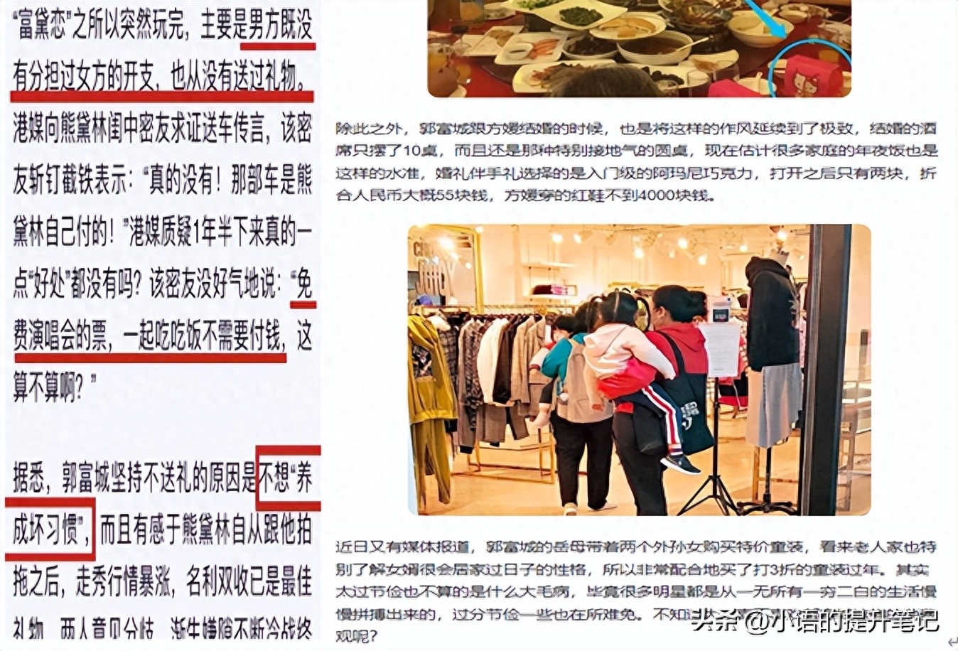 郭富城在圈内是出了名的抠门,对所有的女人都是如此,既没分担过女友的开支,也没有送过礼物,最多就送点演唱会的免费门票,请客吃个饭,而他本人也曾回应过,不送礼是因为不想养成坏习惯,在他的观念里,天王嫂的头衔已经给女方带来很大名利了;
