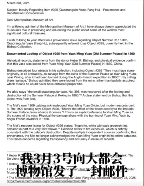 所以,对于纽约大都会博物馆中珍藏的这件方壶,纽约的法律规定必须把这件方壶归还给中国,为了早日实现这件事情,郭杰瑞在3月3号的时候向大都会博物馆发了一封邮件。