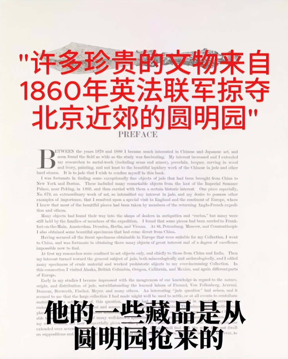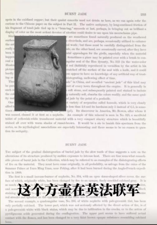 在他进一步的研究之后,他发现了一个更加严重的事实,他找到了一本1906年的书,在书里,捐赠这个方壶的捐赠者Bishop自己承认了他的一些藏品是从圆明园抢过来的。