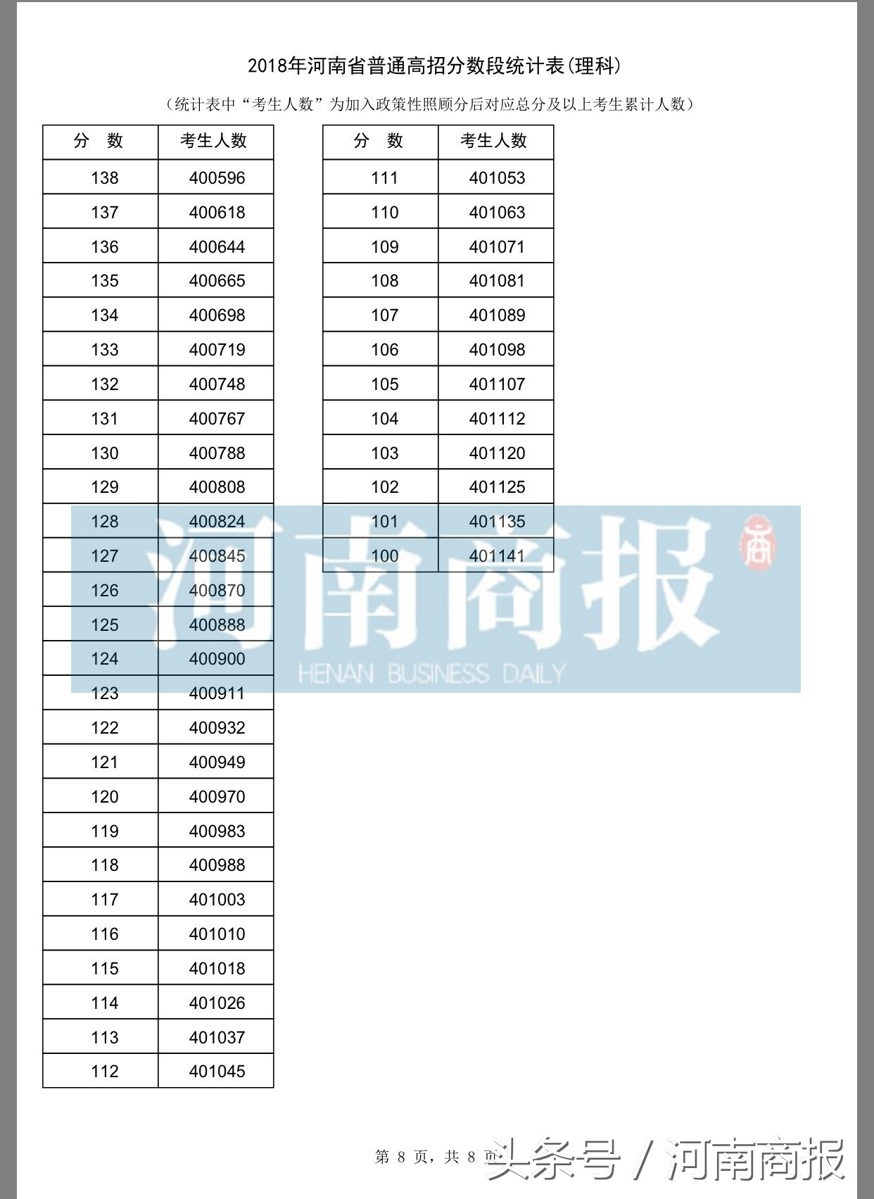 该表中,普通文理科从100分起一分一段一公布,一直公布到最高分。