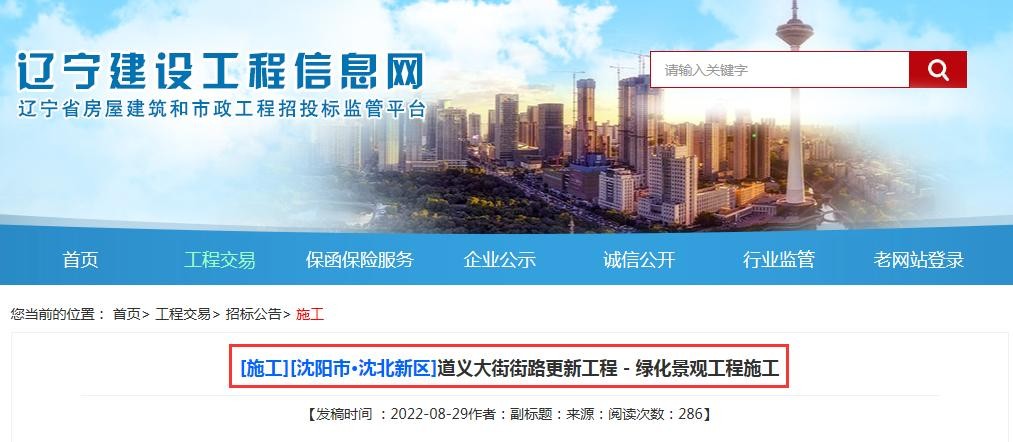辽宁建设工程信息网发布“道义大街街路更新工程-绿化景观工程施工”招标公告。