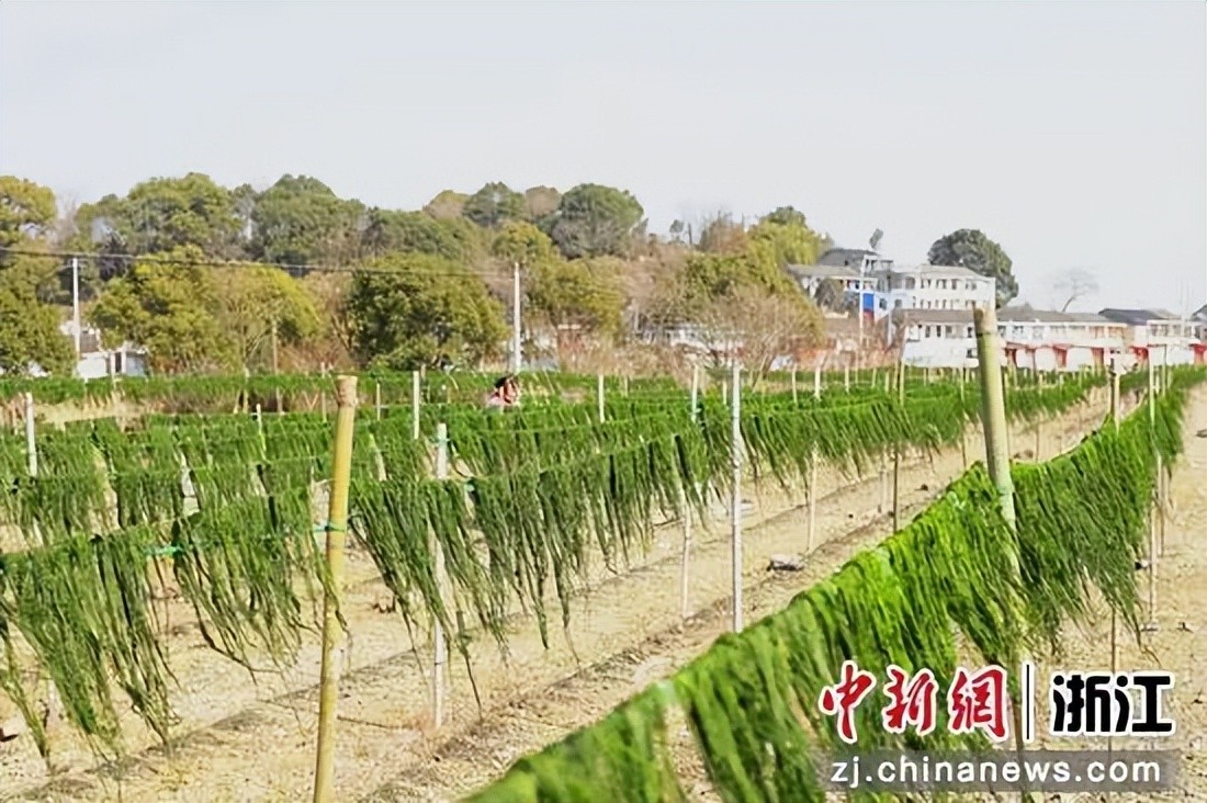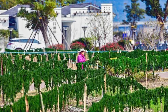 滩涂上,海苔一片葱翠,绿意盎然;在晒场上,一排排、一列列晾在架子上的海苔,散发着大海的鲜香,织就了一幅渔村特有的靓丽风景。