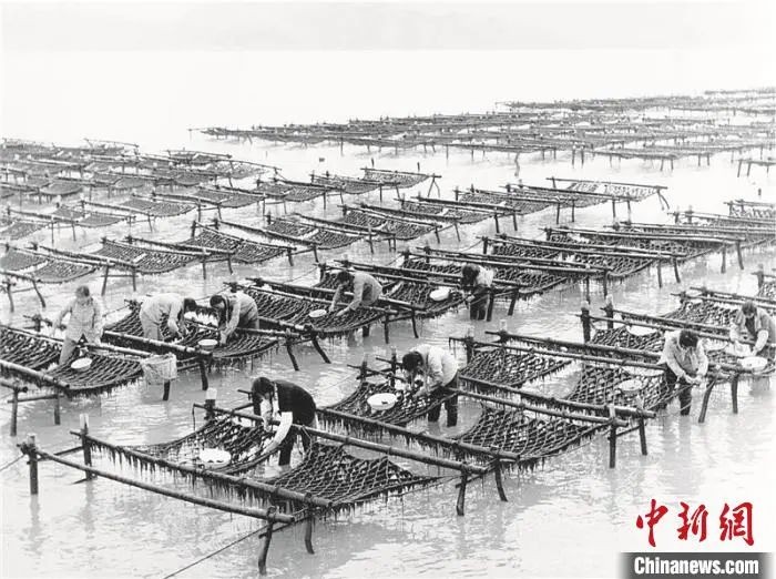 资料图:在浙江舟山,1967年,蚂蚁岛民众在近海收割养殖紫菜。沈有才提供