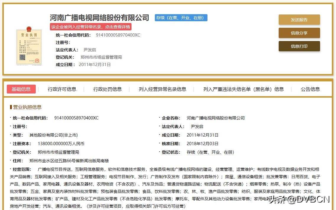 该公司成立于2011年12月31日,注册资本达138000万人民币,该公司疑似由中国广电河南网络有限公司控股(持有19.4%股份,为第一大股东),其余股东涉及数十家县级(市)的有线电视网络公司或运营主体。