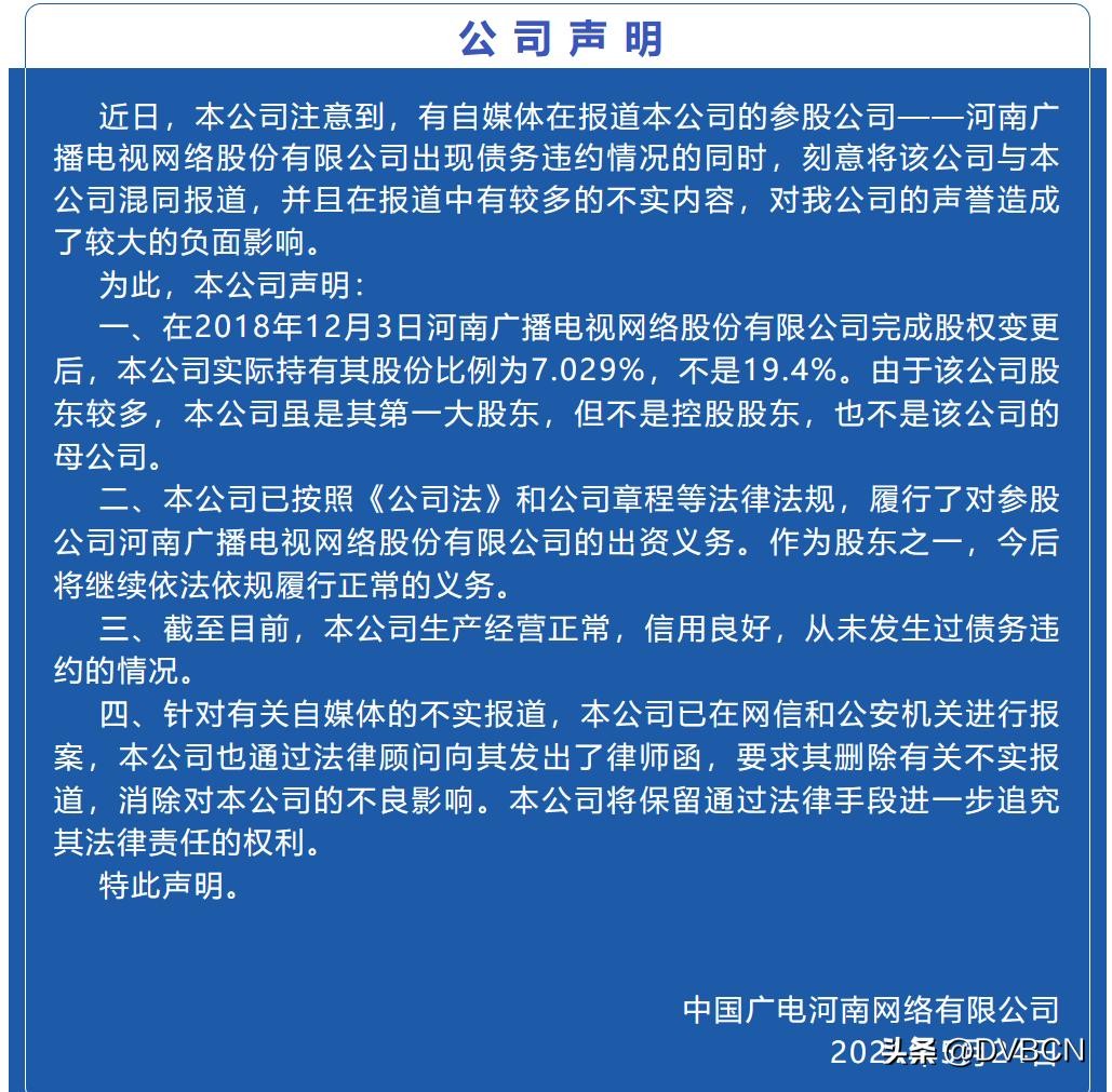 2021年5月24日,中国广电河南公司发声明称,有自媒体在报道其公司的参股公司——河南广播电视网络股份有限公司出现债务违约情况的同时,刻意将两家公司混同报道,并且在报道中有较多的不实内容,声明中明确指出:“2018年12月3日河南广播电视网络股份有限公司完成股权变更后,本公司实际持有其股份比例为7.029%,不是19.4%。由于该公司股东较多,本公司虽是其第一大股东,但不是控股股东,也不是该公司的母公司。”