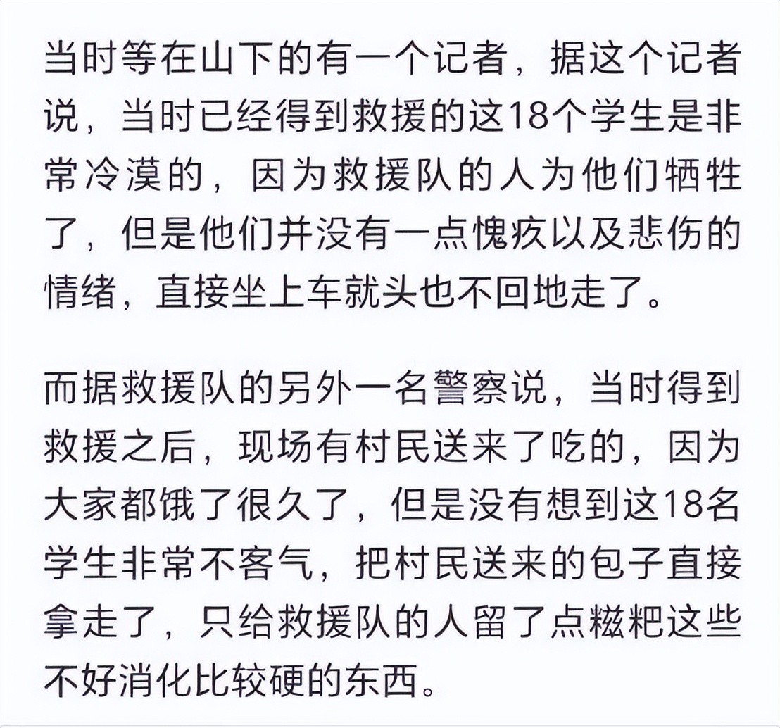”还有人指责救援队的失误,认为他们在凌晨在漆黑一片中摸索下山的决定是第一责任人。这些言论令人震惊,如果救援队不冒险下山,可能十八个学生会冻死。