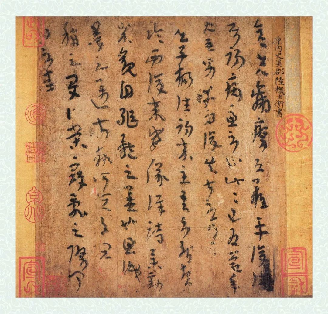 陆机(261~303),字士衡,吴县华亭(今上海市松江区)人。祖陆逊、父陆抗,都是东吴名将。吴亡后入晋,官至平原内史、前将军。后为司马颖所杀。“少有异才,文章冠世”,是著名的《文赋》的作者。他的书法,在书坛有一定地位,王僧虔、庾肩吾等都曾有记述。《平复帖》是现存最早的传世墨迹。