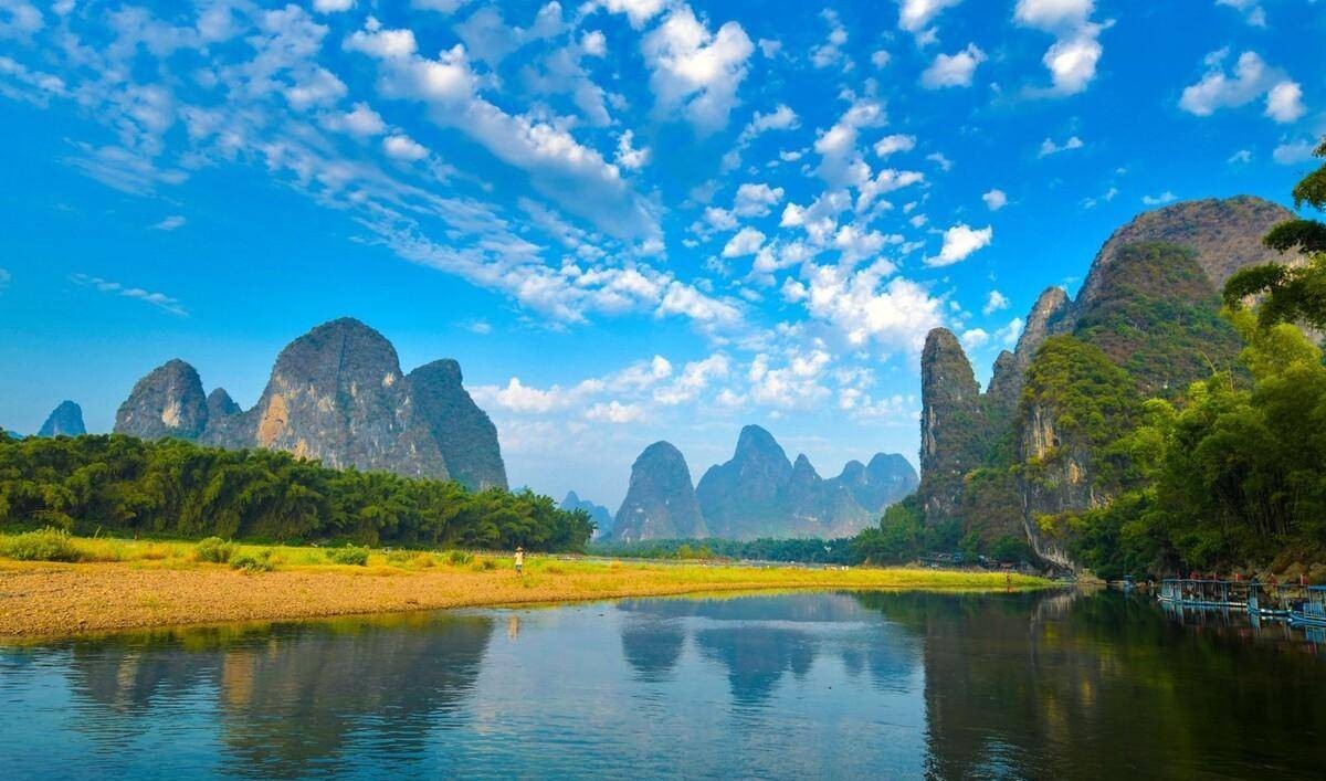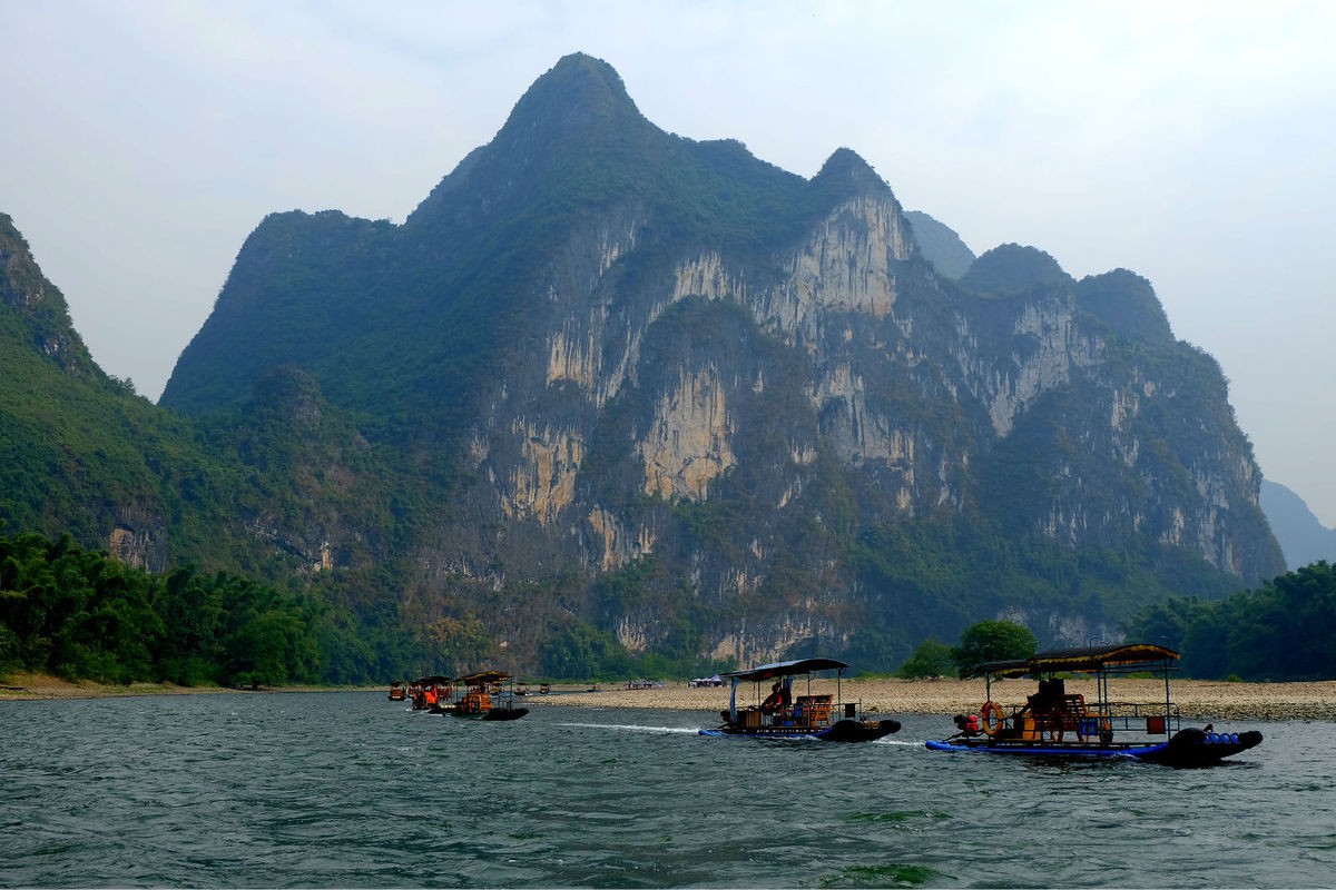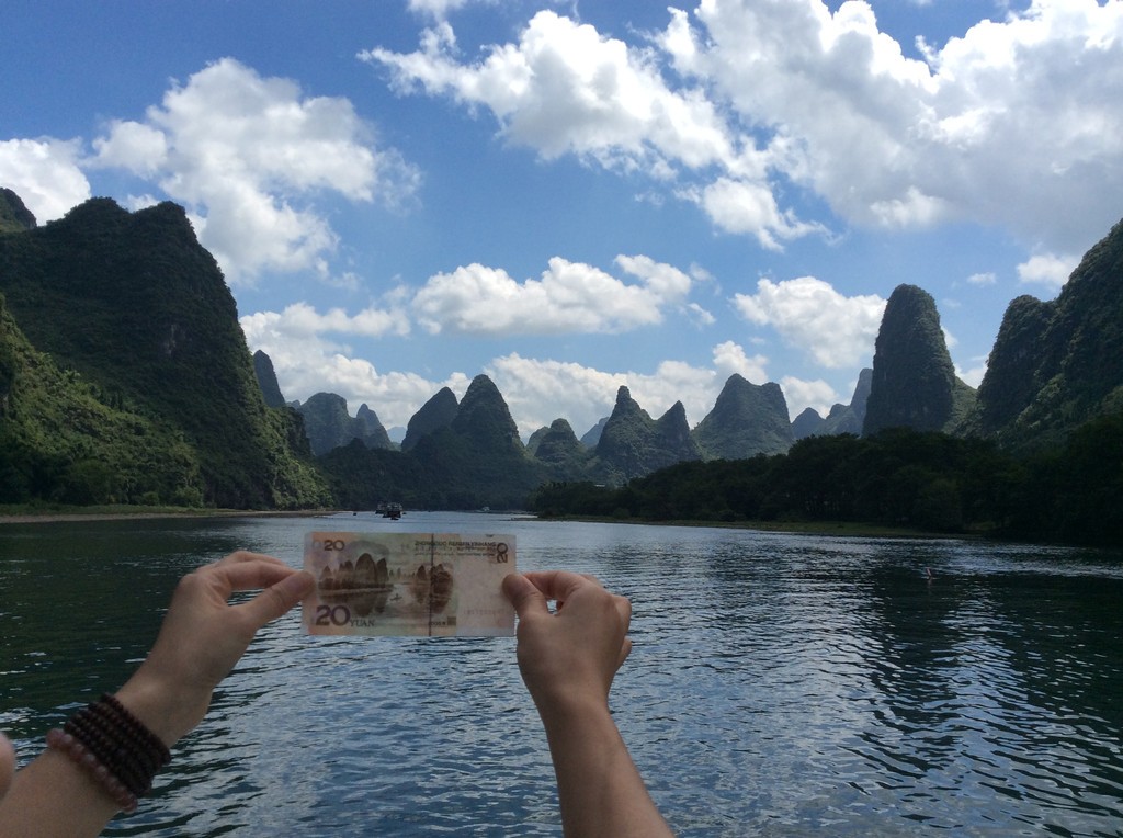 沿江而下,可以欣赏到 20 多个著名景点,比如独秀峰、黄布倒影、九马画山、五指山、八仙过海等等。而20元人民币背面的风景图,就是取自于漓江的黄布倒影。