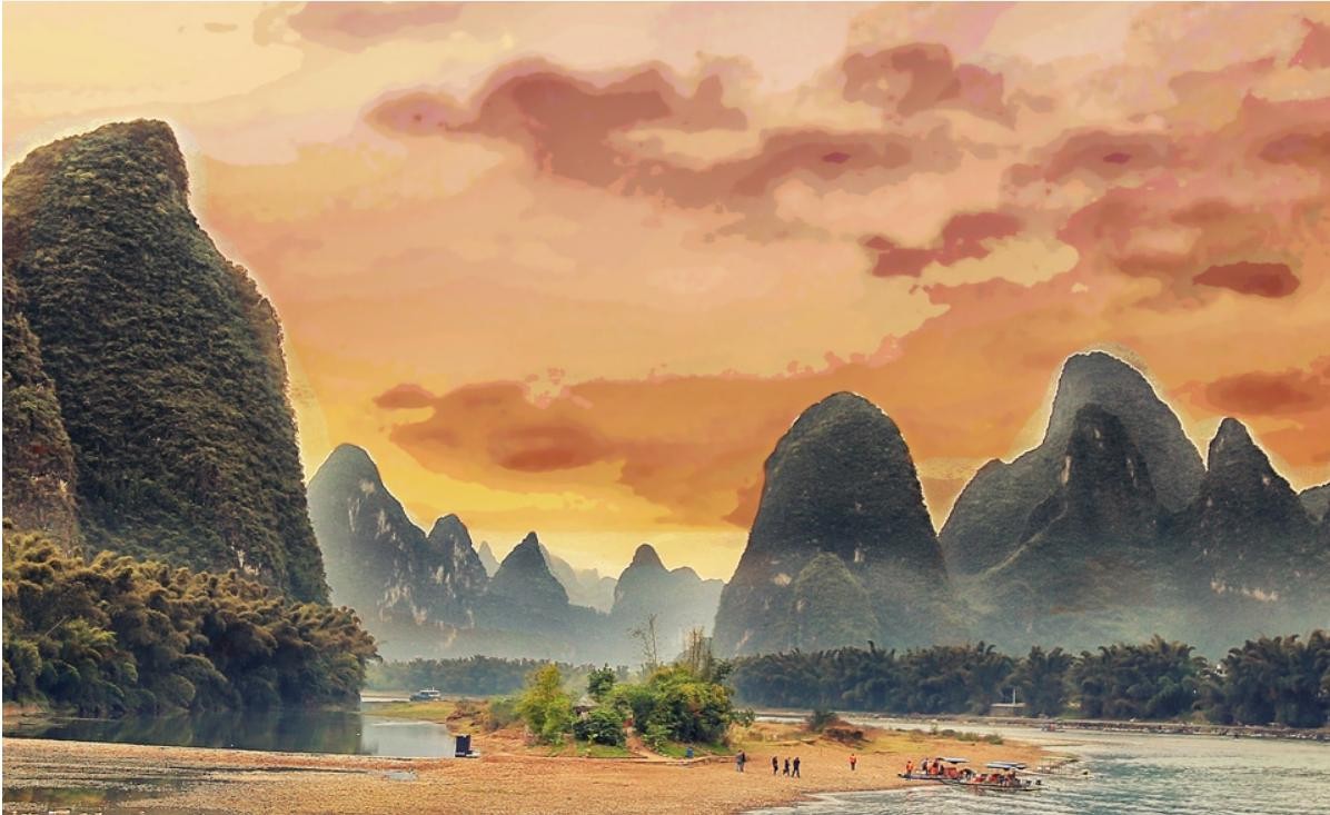 桂林山水甲天下,这里的“水”就是漓江。漓江全长437千米,流域面积28250平方千米,河水清澈碧绿,两岸山峰竞秀,景色各异,构成了“百里漓江,百里画廊”的美誉。