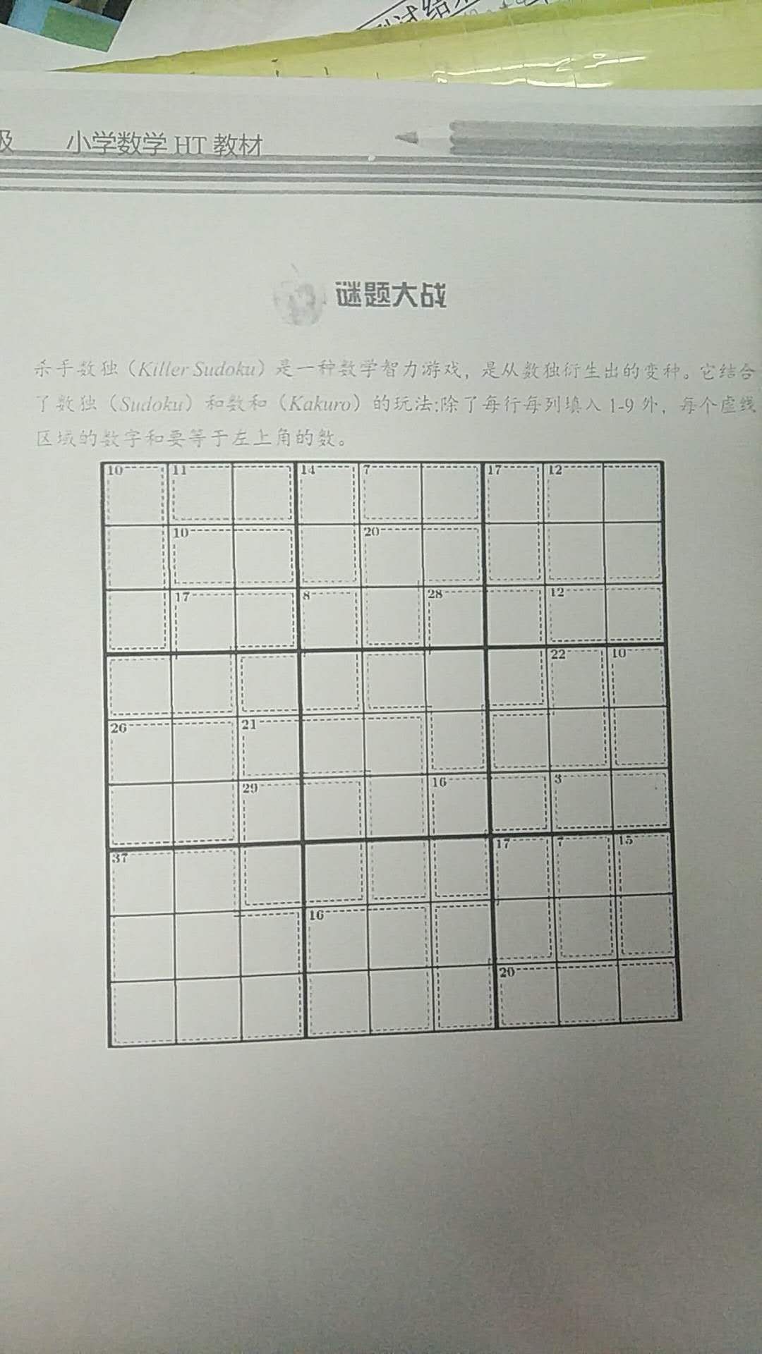 Killer数独:也称杀手数独,是在标准数独的基础上,会有虚线框并且左上角有数字,数字为框内数字之和,每个框内数字不能重复。