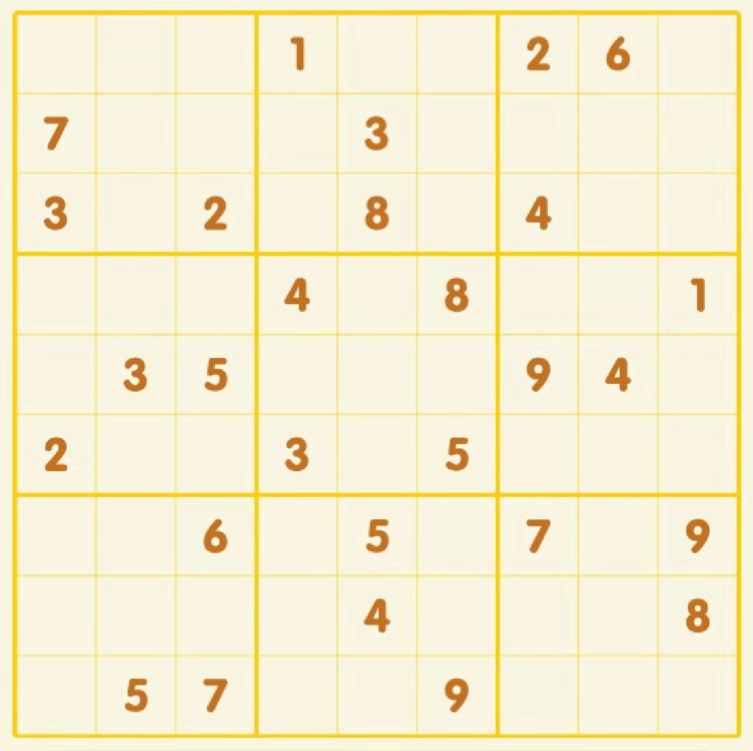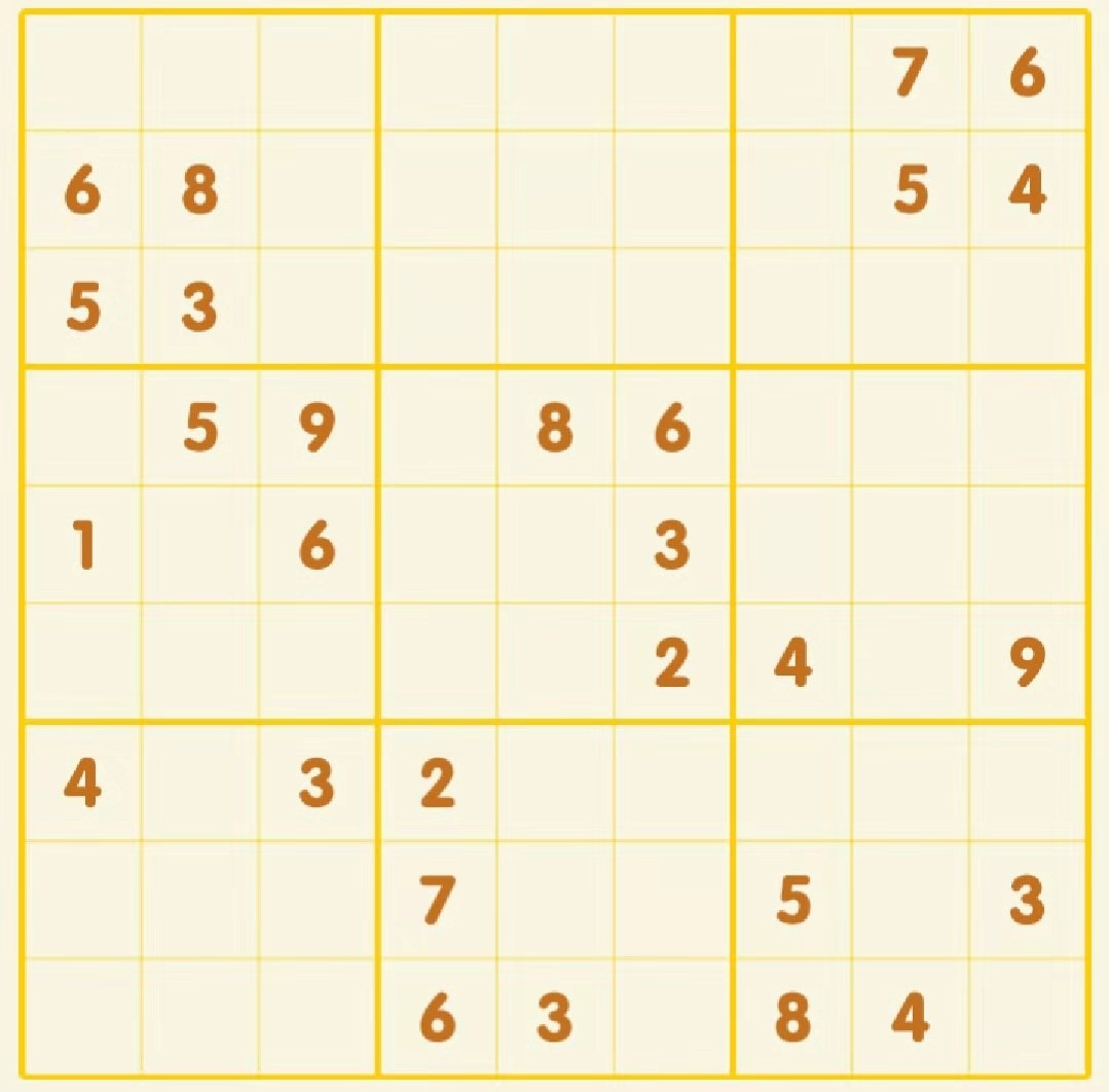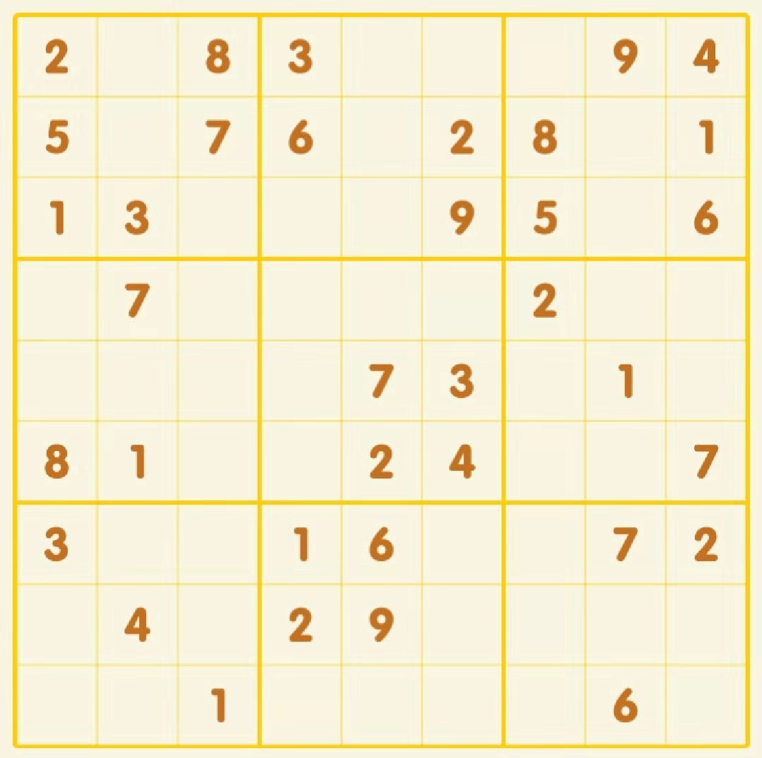 数独(shù dú)是源自18世纪瑞士的一种数学游戏。是一种运用纸、笔进行演算的逻辑游戏。玩家需要根据9X9盘面上的已知数字,推理出所有剩余空格的数字,并满足每一行、每一列、每一个粗线宫(3*3)内的数字均含1-9,不重复。