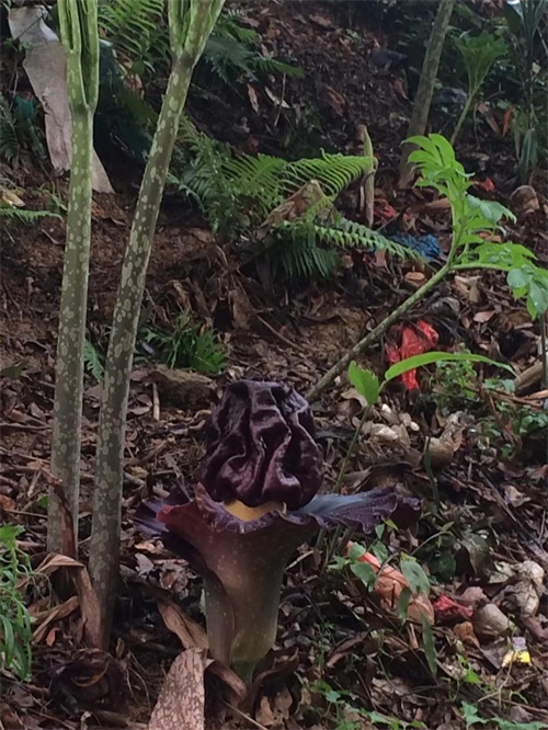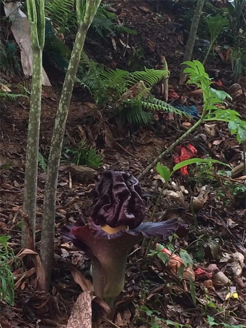 不知道这是不是《鬼吹灯》中描述的尸香魔芋,如果是,味道对得上,色彩对得上,但没有使人产生幻觉,或者这里空旷,不是古墓封闭的地方,如果是封闭的地方,可能真会使人产生幻觉,戴防毒面具还真不管用,实在太臭太臭了。