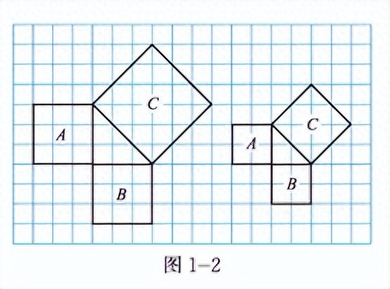 然后比较图形A、B、C之间面积的关系,发现A的面积加上B的面积等于C的面积。
