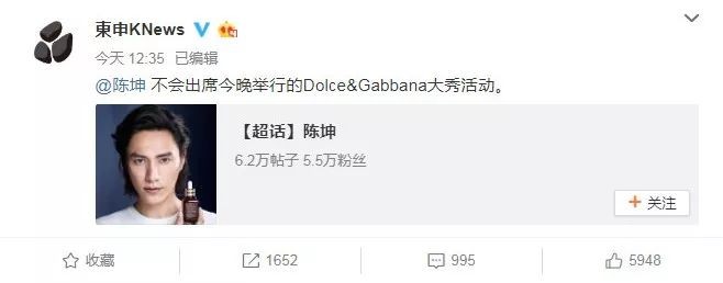 据粉丝爆料,陈坤下了飞机听说这件事之后直接掉头回北京,并且第一个发声明不出席DG秀的。