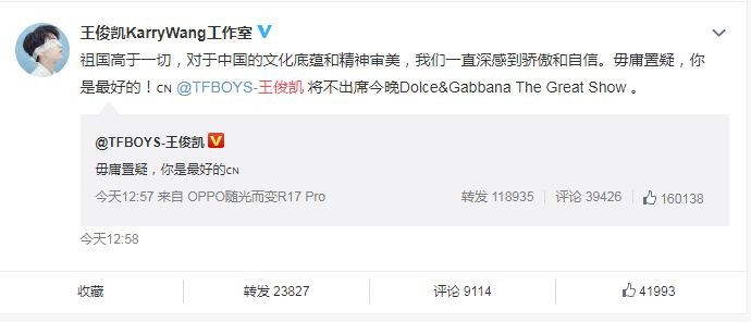 DG中国区大使王俊凯、迪丽热巴也宣布退出宣传活动。