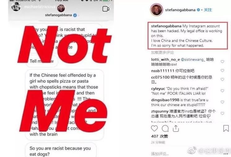 “DG官方Intragram账号和Stefano Gabbana的Instagram账号被盗,我们已经立即通过法律途径解决。我们为这些不实言论给中国和中国人民造成的影响和伤害道歉。我们对中国和中国文化始终一贯的热爱与尊重。”