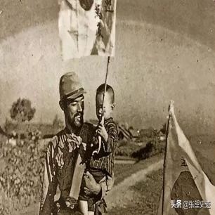 日军士兵抱着一个中国儿童,儿童手上拿着一面太阳旗。