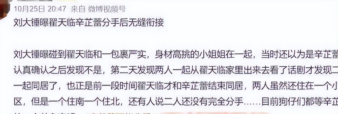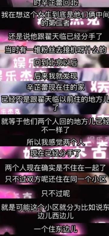 “翟天临和辛芷蕾疑似分手,两人虽住一个小区,但并未同居”。