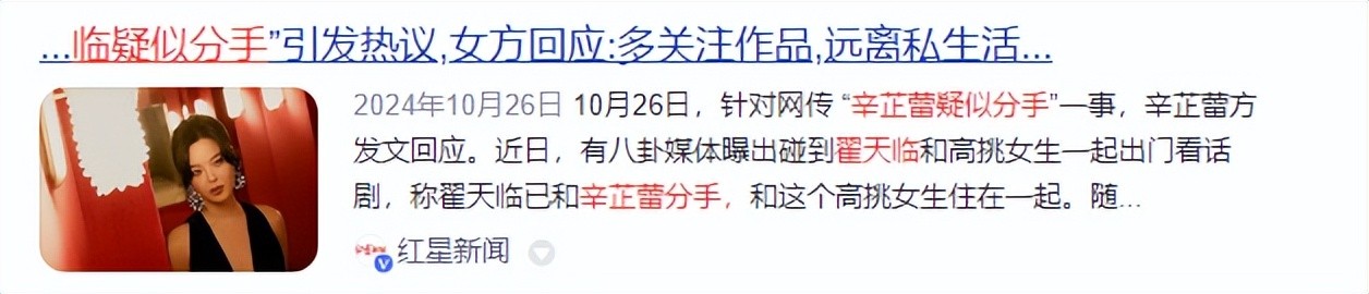 2024年10月26日——红星新闻——网传“辛芷蕾翟天临疑似分手”引发热议,女方回应:多关注作品,远离私生活,我姐独美