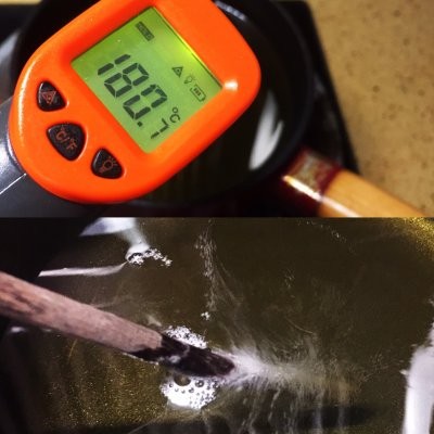 5、第4️⃣步:锅中放油,加热至油温180度。 ‼️关于油温:一成油温30度。一般炸东西使用六成以上油温,没有温度计,可以放一根筷子下去,两秒后筷子冒出大量气泡,筷子周围油面翻滚,油温就差不多了。