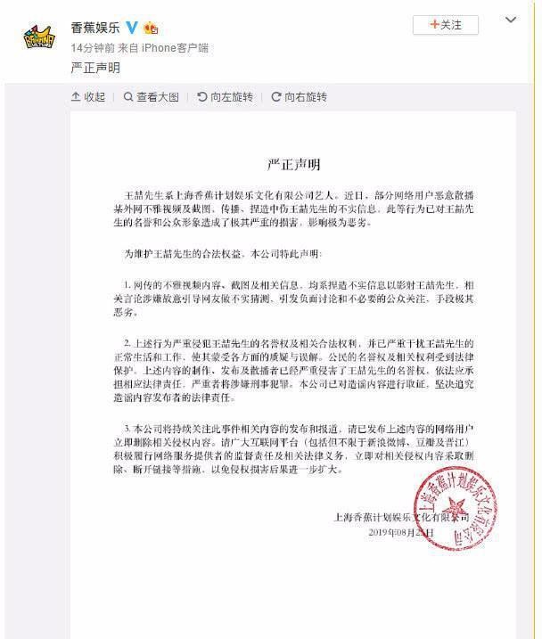 25日,王喆旗下娱乐公司香蕉娱乐正式回应网络不实传闻。针对外界争议及公告,公司发表声明否认传闻。