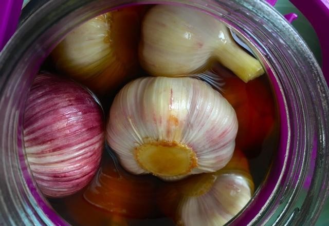 5、把大蒜放在无水无油的密封罐里,然后倒入晾好的水;