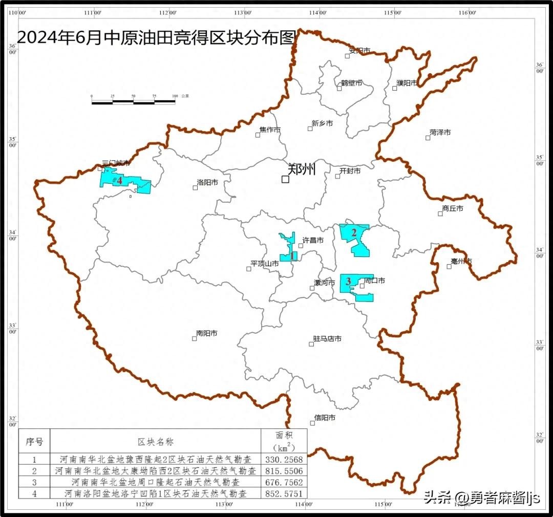 其中位于许昌市、漯河市和周口市境内的南华北盆地周口坳陷带2个区块石油天然气勘查面积分别为330.2568平方千米、676.7562平方千米;位于三门峡市的豫西三门峡盆地东部区块石油天然气勘查面积为852.5751平方千米;位于周口市境内的南华北盆地太康隆起带南部区块石油天然气勘查面积为815.5506平方千米。