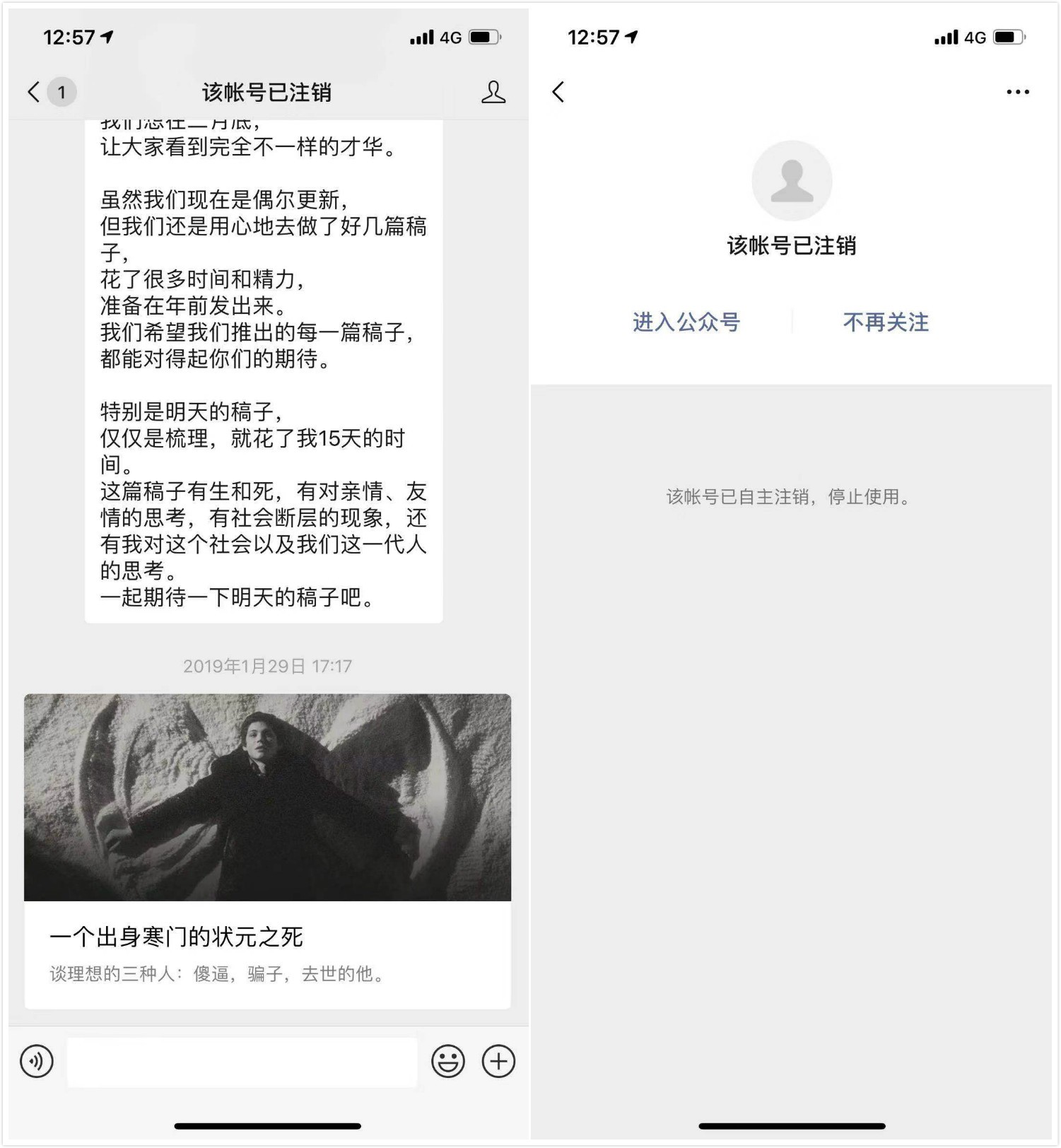 东方网·纵相新闻注意到,2月21日中午前后,公众号“咪蒙”已显示“该账号已注销”。除此之外,因《一个出身寒门的状元之死》一文引发的争议“才华有限青年”也已注销。目前,两个账号均已无法被搜索到,具体原因咪蒙相关方面暂未回应。