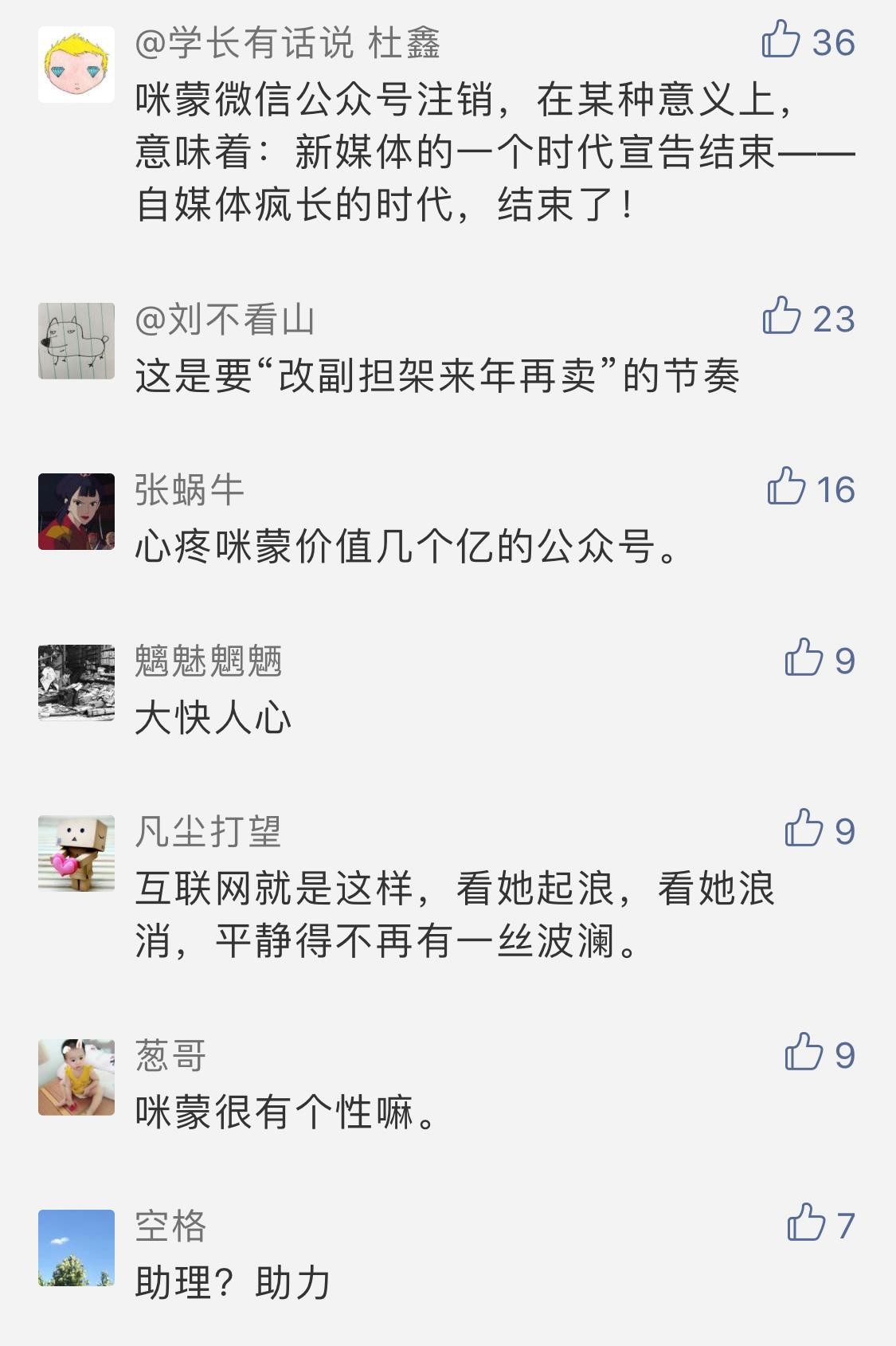 对于咪蒙选择以自主注销的方式退出微信公号社交平台,网友发表了各自的看法: