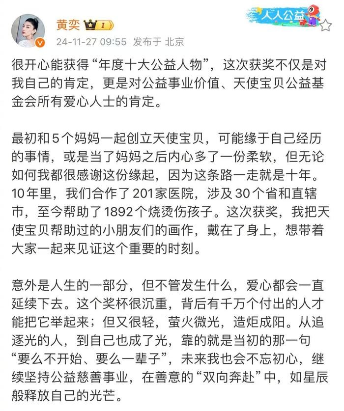 原本以为她早已是过气的女星,但没想到11月26日晚,凤凰网行动者联盟2024公益盛典在北京隆重举行,黄奕凭借出色的公益贡献,荣获“年度十大公益人物”称号。