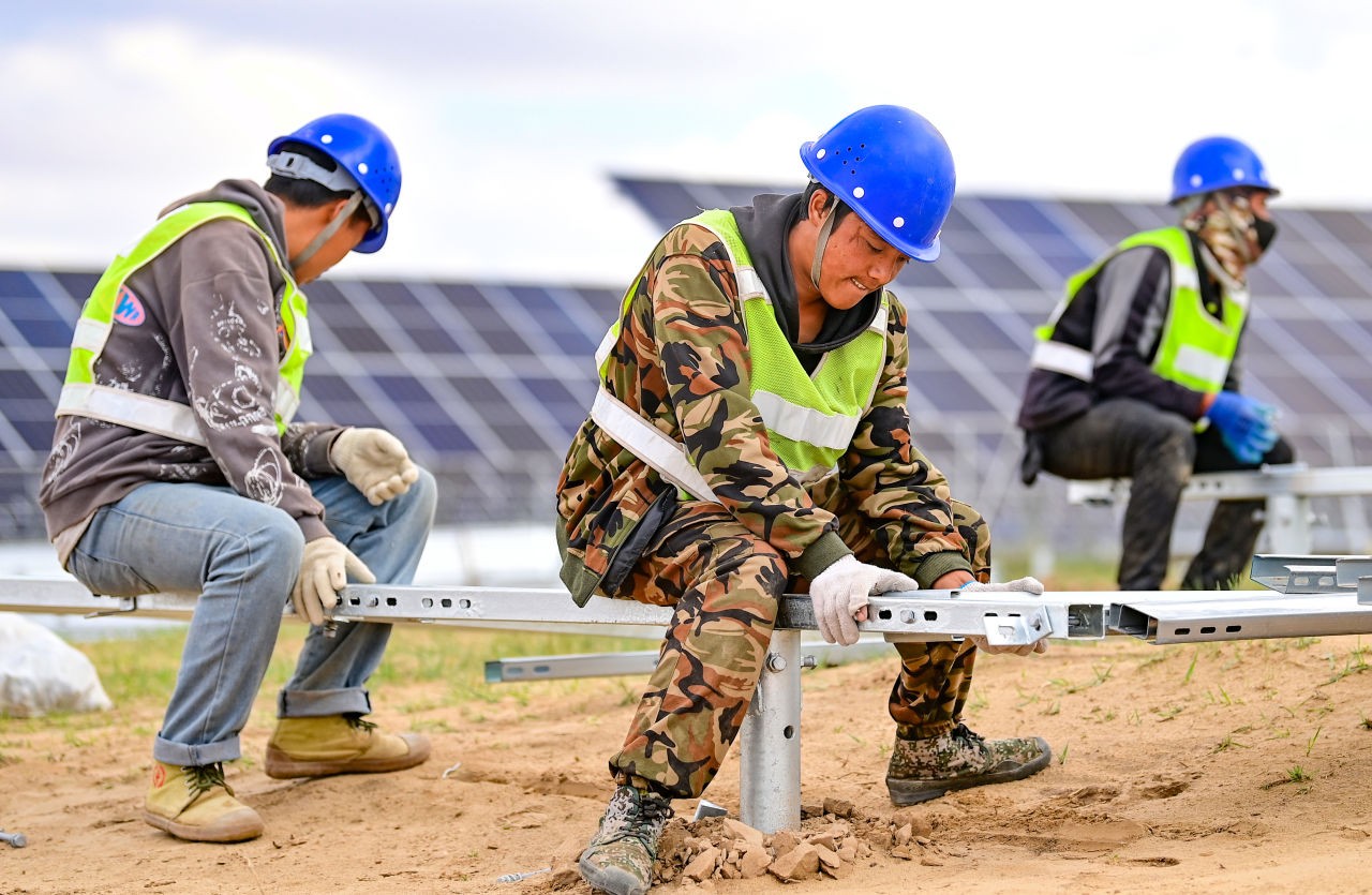 2023年8月27日,内蒙古鄂尔多斯,施工人员在鄂托克前旗一处光伏电站项目建设工地安装光伏板支架。视觉中国|图