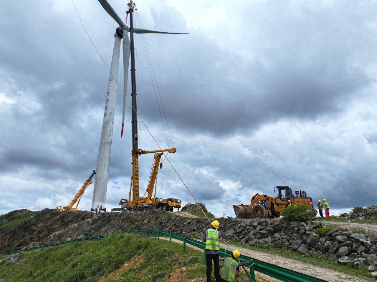 2024年9月6日,江西省吉安市泰和县水槎乡西阳村某风力发电场,机械设备正在吊装风机叶片。视觉中国|图