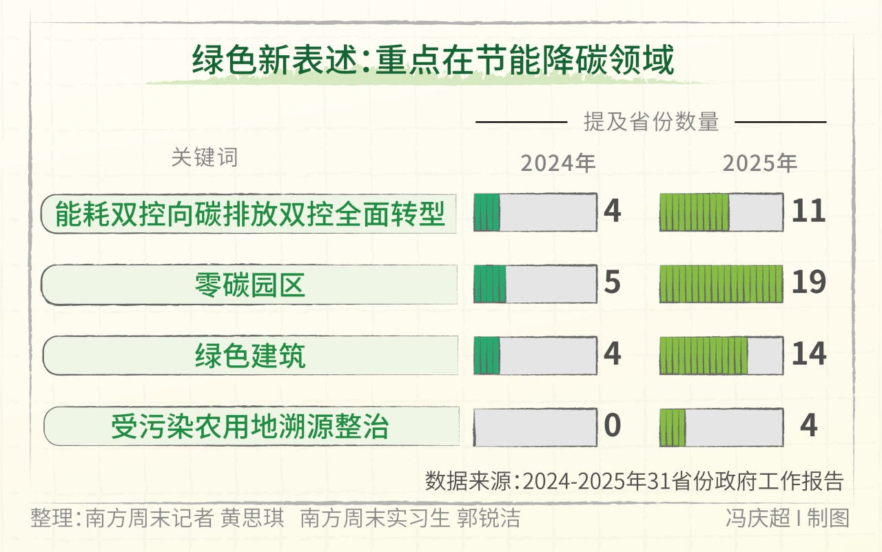 这些词汇串起了全国各省份的绿色转型计划。2025年是“十四五”规划收官之年,是“绿水青山就是金山银山”理念提出20周年,也是我国 “双碳”目标提出5周年,各省份亦在政府工作报告中做了呼应。