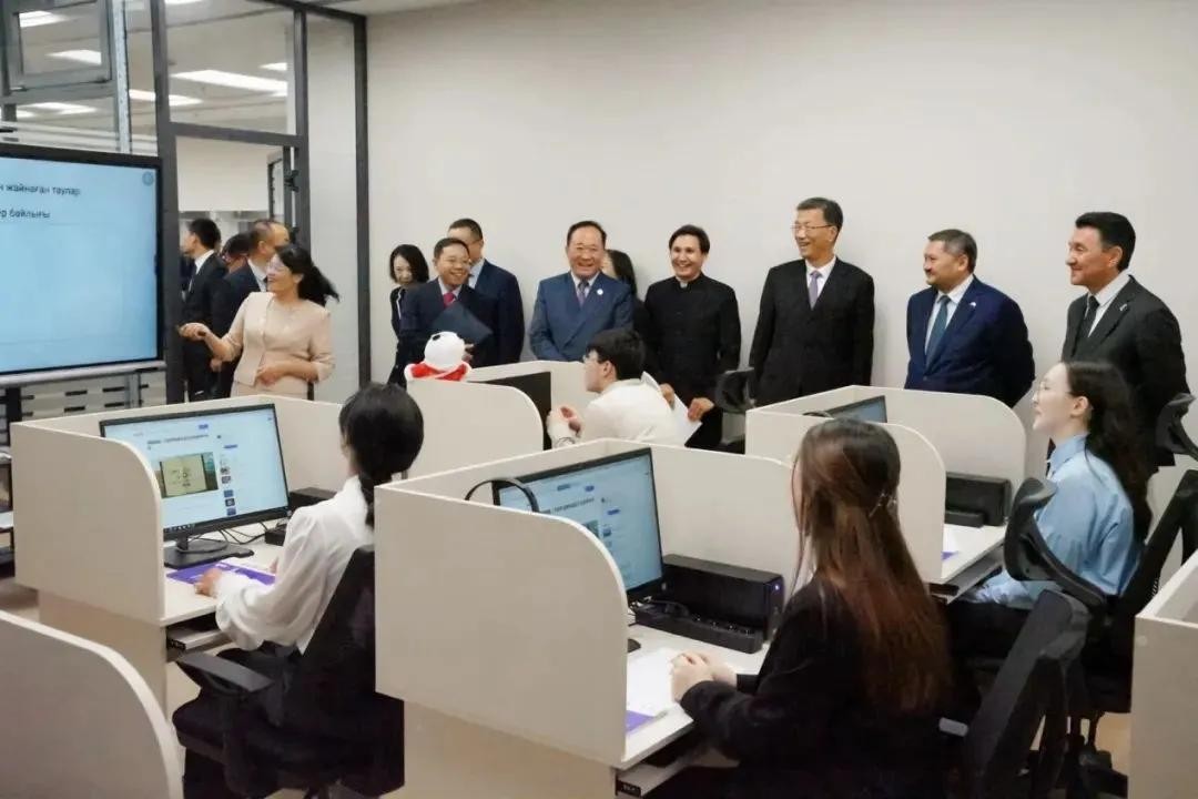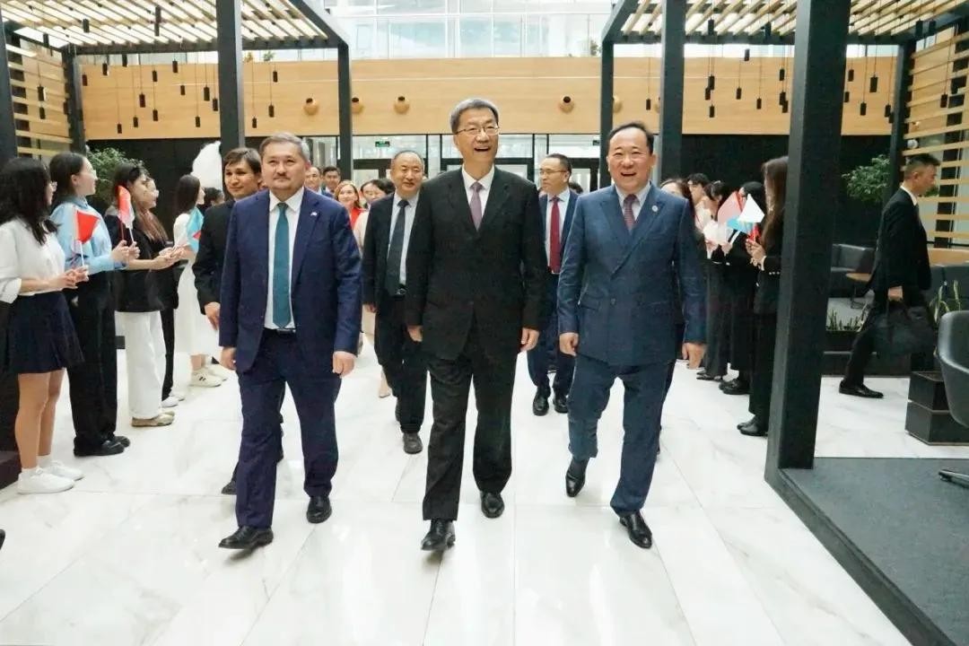 中国教育部部长怀进鹏、哈萨克斯坦科学和高等教育部部长努尔别克向两国元首报告后,北京语言大学校长段鹏和阿斯塔纳国际大学校长伊尔萨利耶夫共同为北京语言大学哈萨克斯坦分校揭牌。