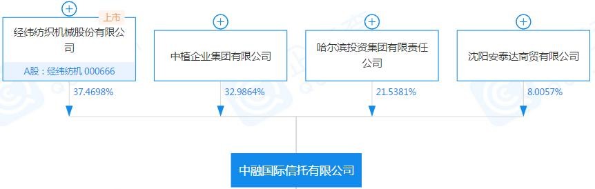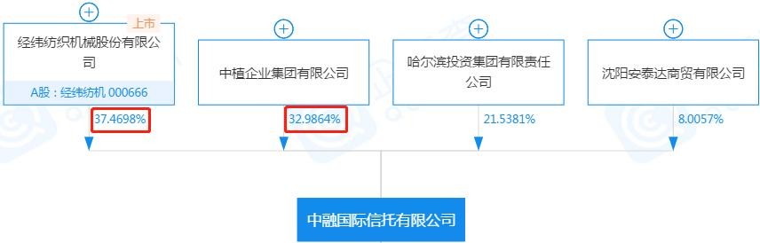 一是从股权结构来看,经纬纺机持有中融信托37.47%的股权,也是公开承认的控股股东,而且无论是经纬纺机的年报还是中融信托的年报都公开披露经纬纺机是中融信托的控股股东。