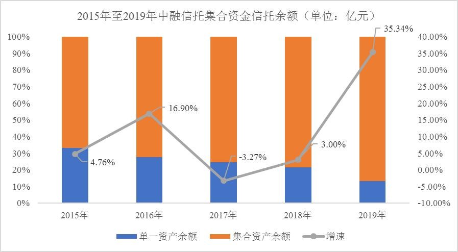 2019年在监管部门强力推动"去通道、控地产"的大背景下,中融信托集合资金信托管理规模较2018年扩大了35.34%,达到6,126.53亿元,占2019年末信托余额的80.04%,成为继中信信托后第二个迈入"集合资金信托余额6000亿"
