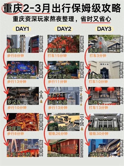 想要玩转重庆,怎能不先了解这份时间线行程?Day1重点打卡解放碑商圈到洪崖洞夜景,Day2探访老君洞到湖广会馆,Day3沉浸白公馆到歌乐山革命纪念馆的红色记忆。