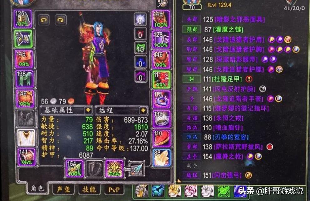 然而问题在于,这种配装的猎人真的不能打祖阿曼吗?显然并不是。这名猎人的命中是完全达标的,攻强也差强人意,祖阿曼的副本难度摆在那里,这种猎人完全可以在祖阿曼中胜任DPS,甚至打个前三也不成问题。