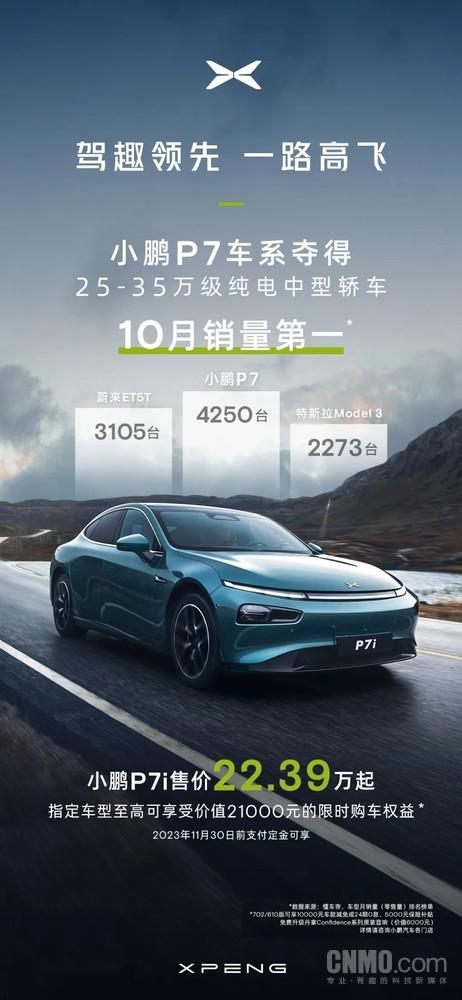 另外一边,小鹏 P7 车系夺得 10 月 25 万 -35 万级纯电中型轿车销量第一,连续两个月位居销量榜首位。就在 11 月 6 日,小鹏 P7i 推出新版型,小鹏 P7i 550 版起售价为 22.39 万元,延续了 " 入门即高配,标配即高配 " 的原则。据悉,小鹏 P7i 推出了指定车型至高获 2.1 万元的限时购车政策,此举或将让小鹏 P7i 获得更多关注和销量。