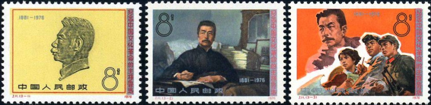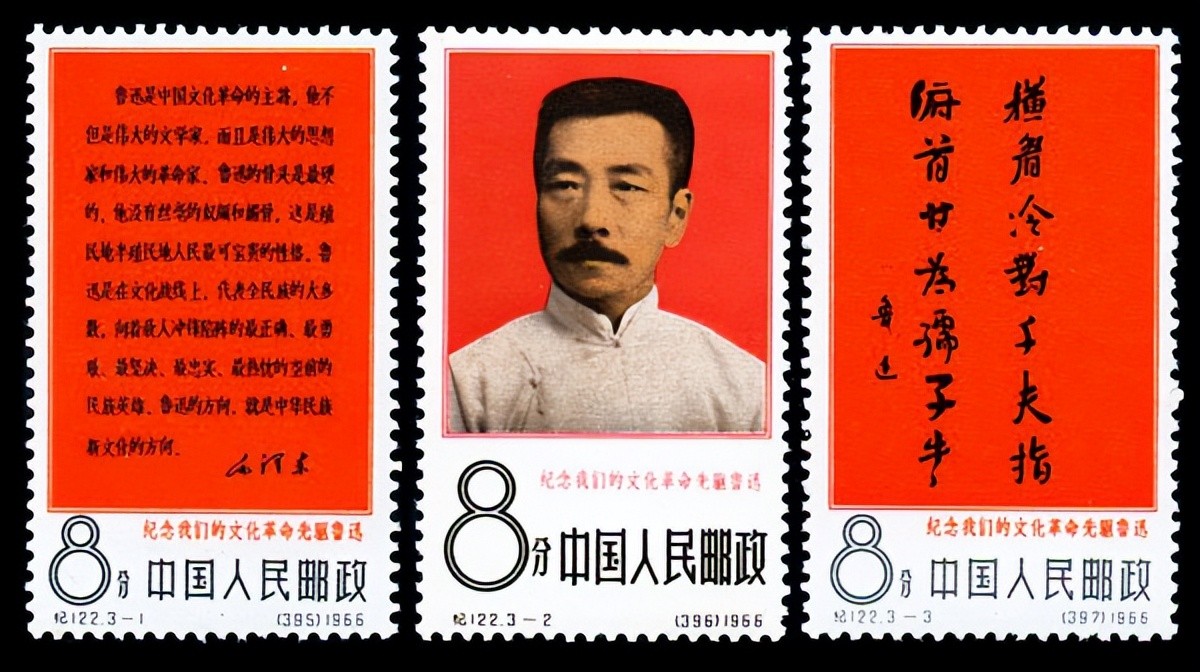第一张邮票是伟人对鲁迅的评价:“鲁迅是中国文化革命的主将,他不但是伟大的文学家,而且是伟大的思想家和伟大的革命家。鲁迅的骨头是最硬的...”。