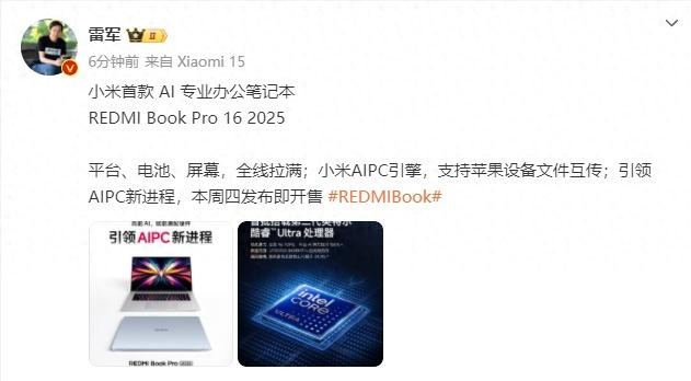 今天中午,小米创办人、董事长兼CEO雷军在微博表示,小米首款AI专业办公笔记本REDMI Book Pro 16 2025将于本周四发布,并且发布即开售。