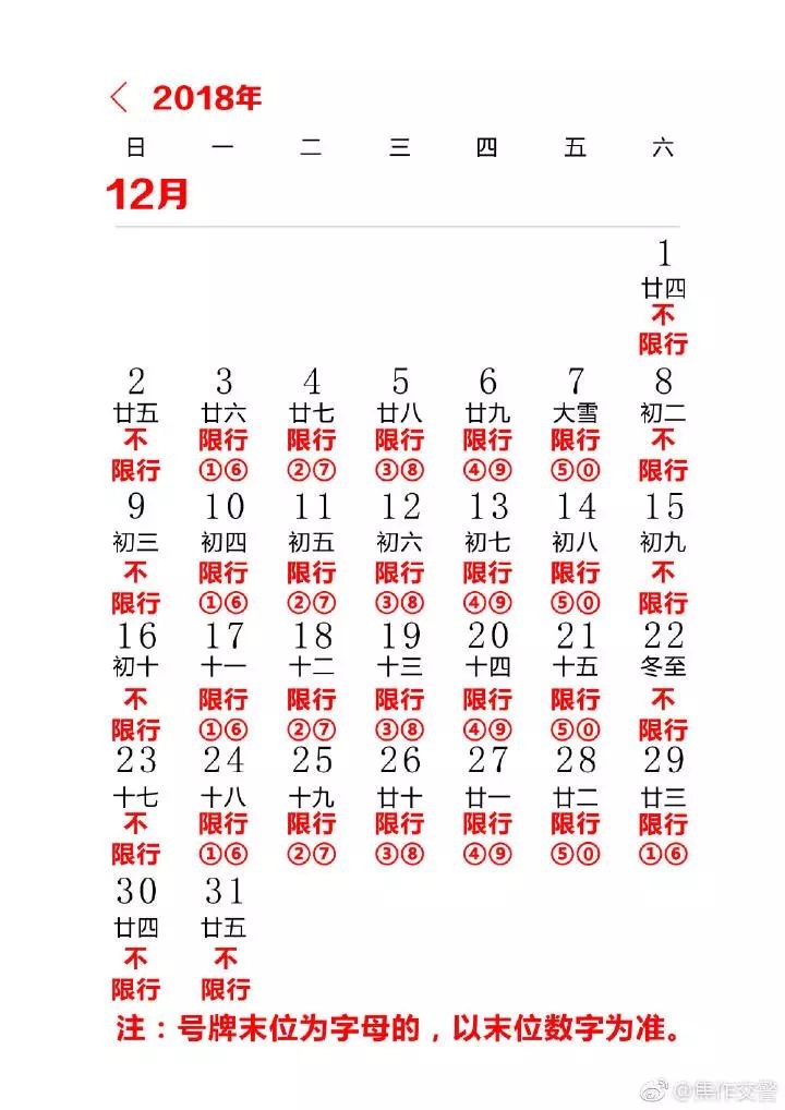【限行重要提示】2018年12月29日(周六)机动车限行尾号1和6,2018年12月30日至2019年1月1日不限行。