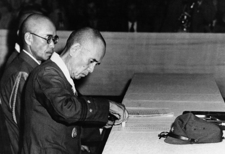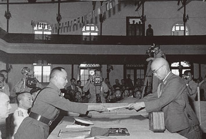 蒋介石对冈村宁次的包庇,要从1945年8月日本投降说起。在接受投降仪式上,蒋介石特意安排何应钦代表中国政府接受冈村宁次的投降。