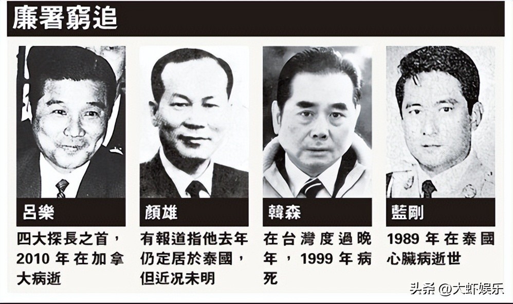 与吕乐齐名的另外三名探长也纷纷逃离香港,1989年蓝刚在泰国病逝,1999年韩森在台湾病逝,颜雄逃亡泰国后下落不明。