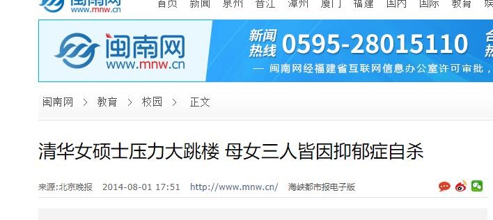 信源|闽南网—清华女硕士压力大跳楼 母女三人皆因抑郁症自杀